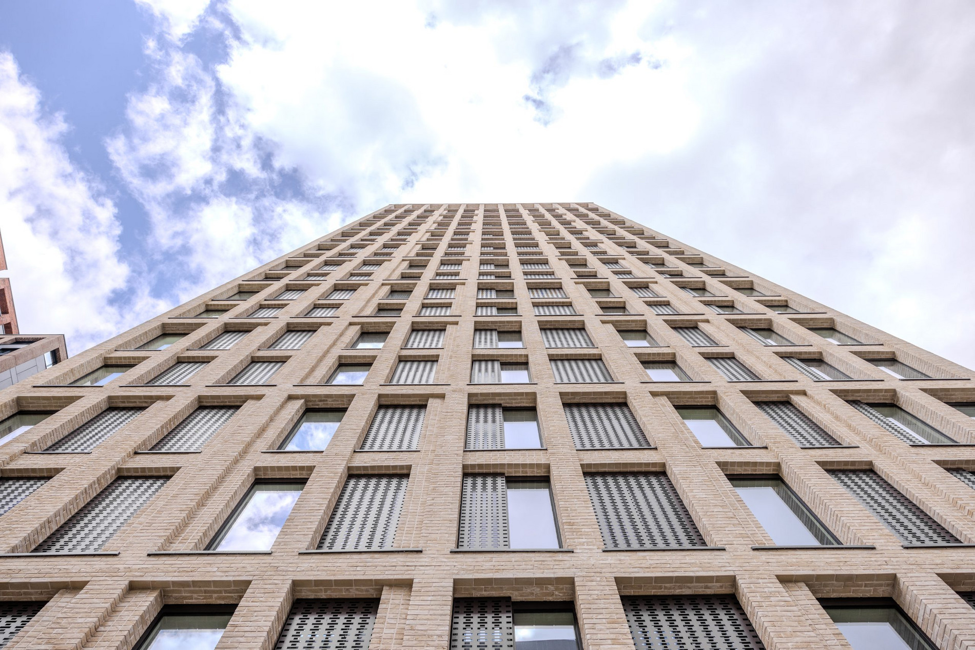 As the concrete core was constructed using slip form techniques, the alsecco system was installed in tandem, floor-by-floor. The cladding installation team mechanically fixed and adhered insulation boards to the sheathing boards on the SFS framing. A weatherproof façade was established swiftly through the mesh-reinforced basecoat render layer, enabling the brick slipping teams to follow closely behind on mast climbers, applying the slips and corners and dressing the bonding mortar to an authentic brick pointed finish.